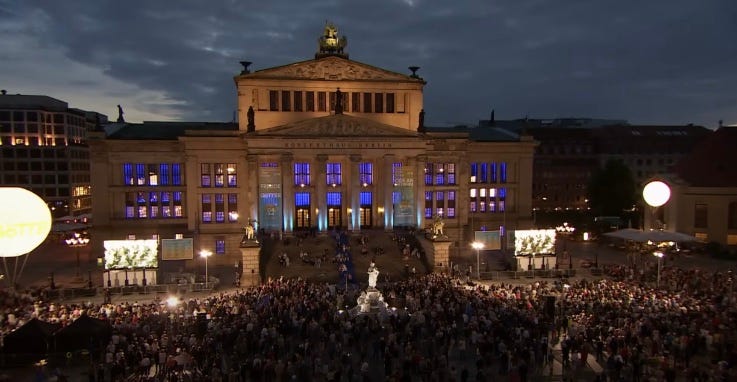 A minap a MEZZO egy páréves felvételt közvetített a berlini opera előtti térről. Bent, az épületben az európai egyesített ifjúsági kórus Beethoven örömódáját adta elő, de nem is ez volt a felvétel különlegessége, hanem az, hogy óriáskivetítő képernyők segítségével az impozáns téren emberek százai követték az előadást.